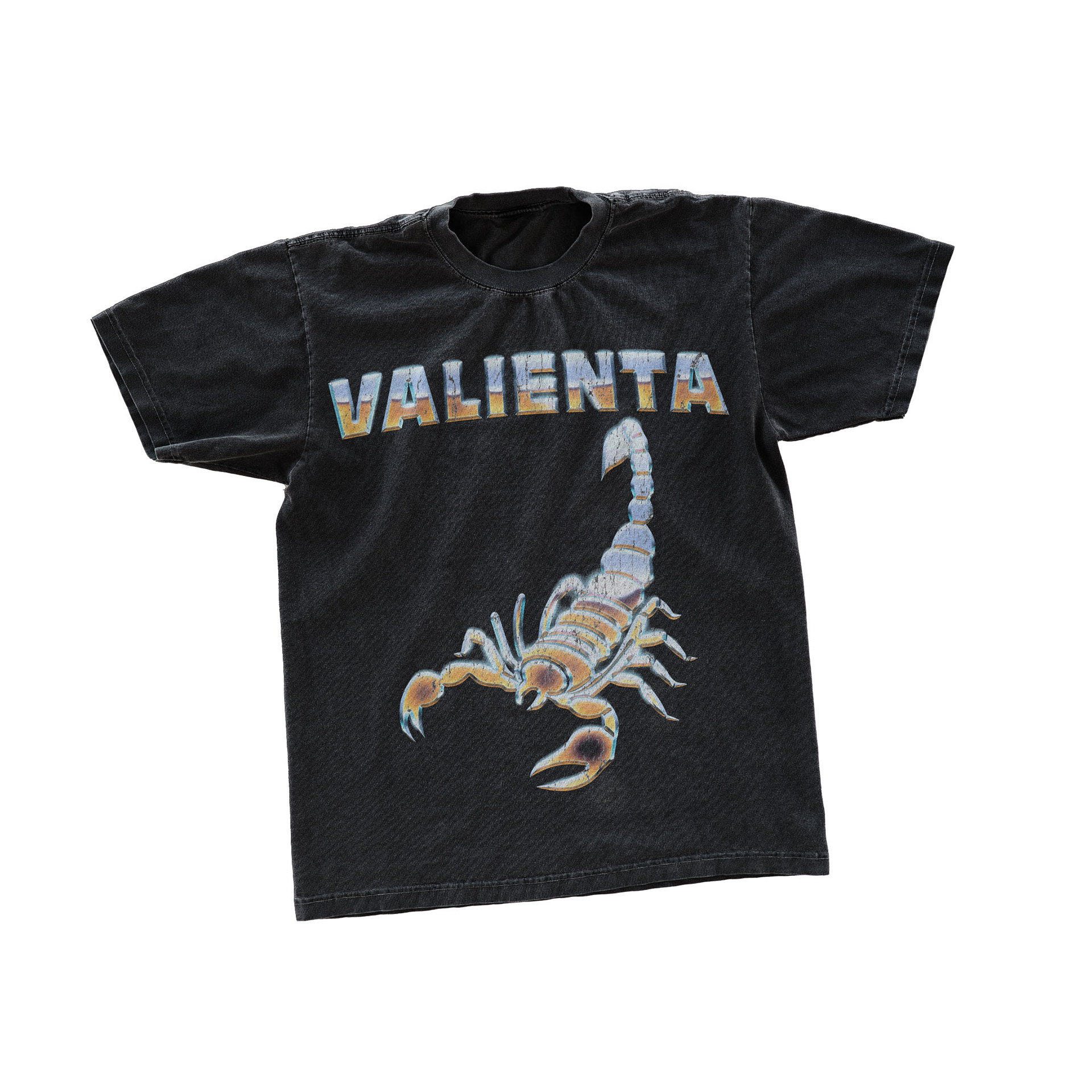 SOLUTION: Created a chrome scorpion design with the name “VALIENTA” in large text. Color-separated and ready for screen printing.